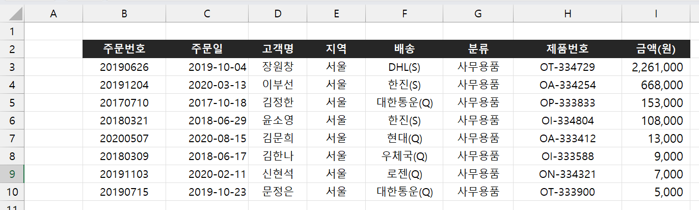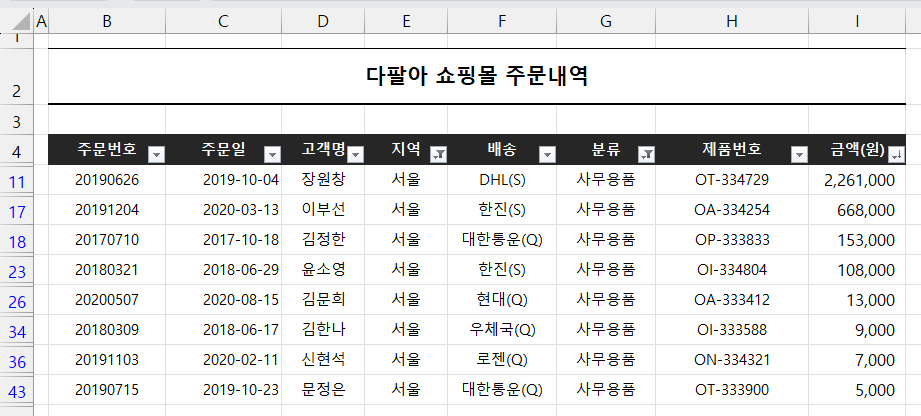 가령 직장 상사가 "서울지역의 사무용품 판매현황 알려줘"라고 했는데 위 파일을 그대로 보여주게 되면 "네가 해!"라고 하는 것과 다름없겠죠. 필터링하고 정렬한 후 인쇄하거나 파일을 보내줘야 됩니다.
