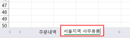 새 시트 만들기 - 좌측 하단 + 아이콘을 클릭하여 새 시트를 추가 > 서울지역 사무용품으로 시트이름을 변경합니다.