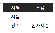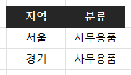 반드시 서울 옆 셀에도 사무용품이 경기 옆 셀에도 사무용품이 입력되어 있는 위와 같은 형태가 되야 됩니다.