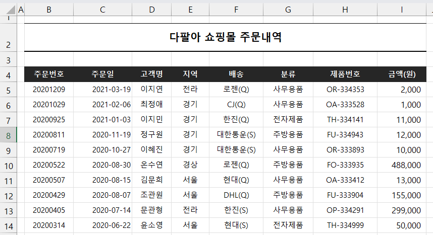 마찬가지 방법으로 조건범위에 가장 위셀에 "분류" 조건을 추가합니다. 이렇게 조건은 조건범위의 가장 윗줄에 행이 아닌 열로 추가하면 조건이 추가됩니다. 계속해서 배송을 추가하거나 금액을 추가 할 수도 있습니다.