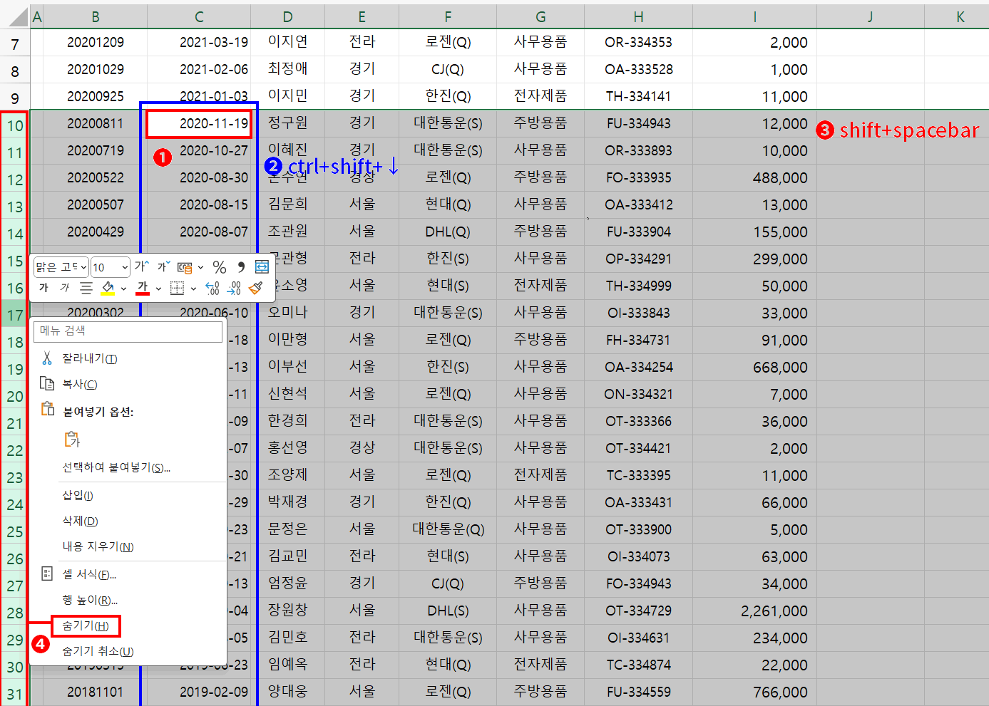 (표가 긴 경우에는 단축키를 사용하시면 쉽게 행전체를 지정할수 있습니다.) - 행머리를 우클릭하신 뒤 숨기기 합니다.