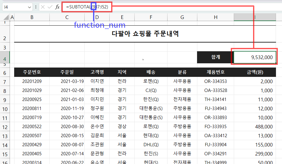 아래 예제 파일을 보시면 지금까지 해온 다팔아 쇼핑몰의 주문내역입니다. 이번에는 I4셀에 SUM함수를 이용하여 판매된 금액의 합계를 냈습니다. 흔하게 사용하는 형태입니다. 보통은 합계를 표