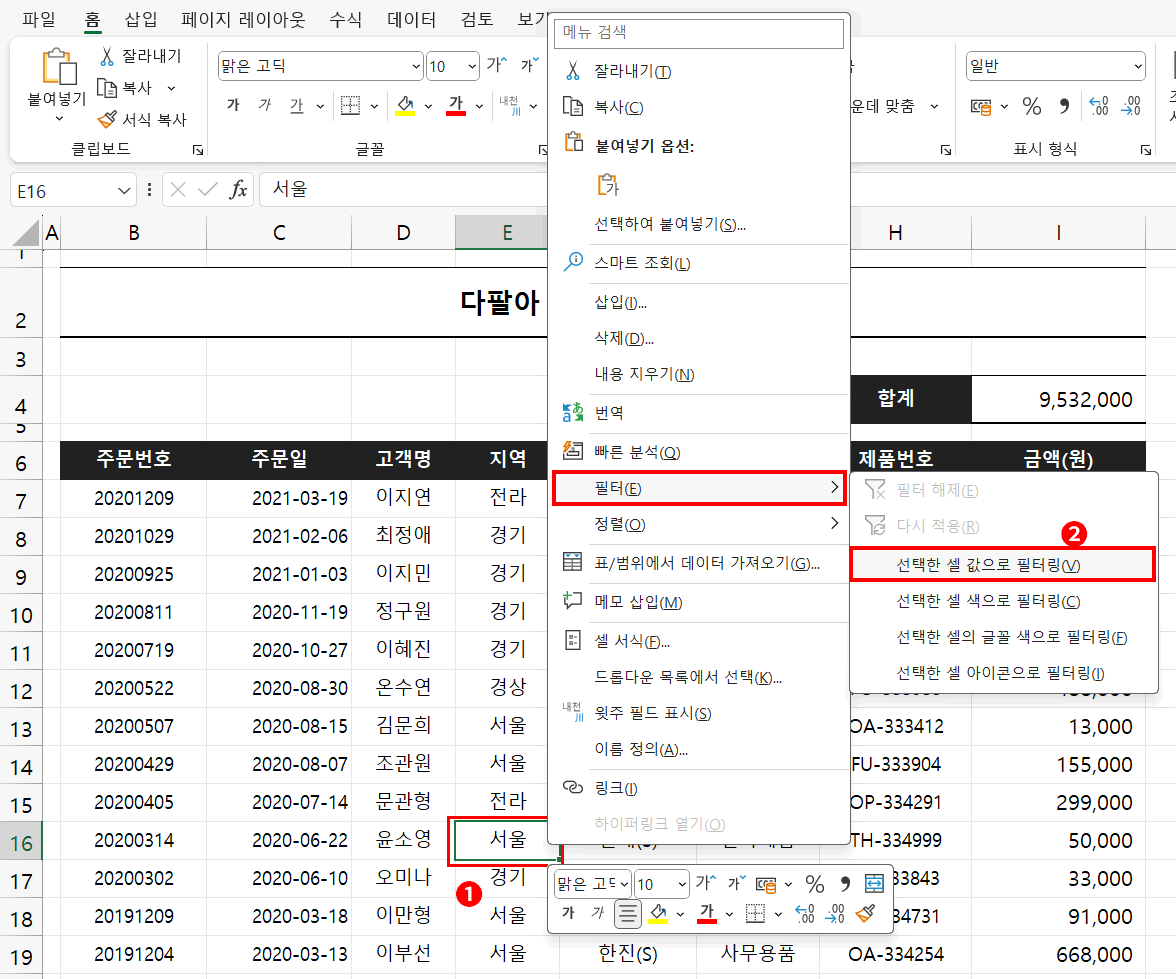 - 팝업메뉴에서 필터 > 선택한 셀 값으로 필터링