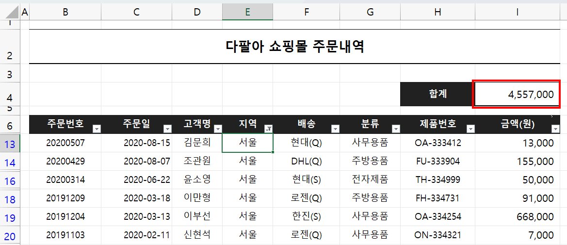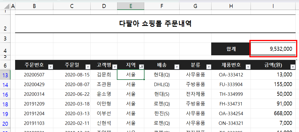 이제 하고자 하는 것은 서울지역을 필터링하고 합계를 알고 싶습니다.