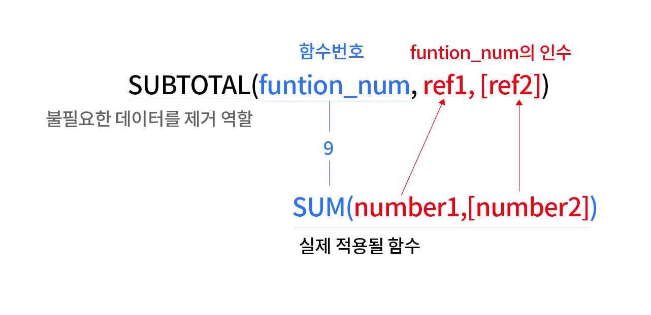 이렇게 SUBTOTAL은 사실상 실제 함수인 function_num에서 불필요한 요소를 제거하는 역할을 하는 것이죠