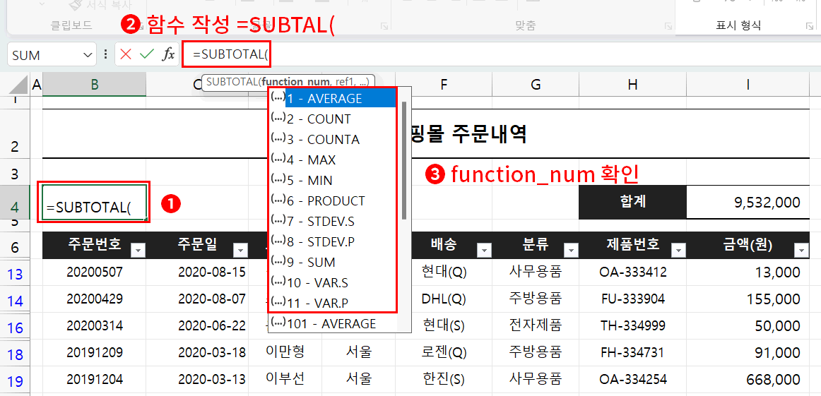 - SUBTOTAL의 첫 번째 인수인 function_num이 표시됩니다.