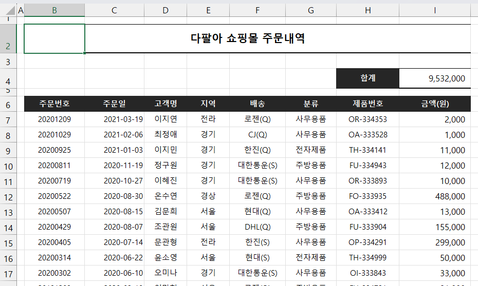아래 예제 파일을 보시면 지금까지 해온 다팔아 쇼핑몰의 주문내역입니다.