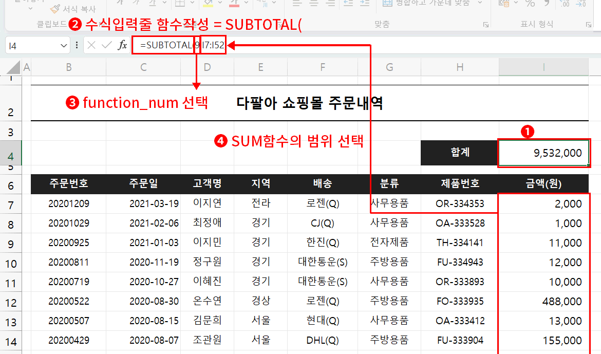 이 경우에 사용할 수 있는 것이 SUBTOTAL 함수입니다.