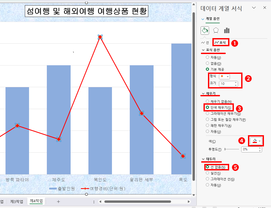 - 표식을 클릭합니다.=> 표식옵션, 채우기, 테두리가 하부 옵션으로 있으며 각각을 클릭하며 또 그 하부의 옵션을 설정할 수 있습니다.